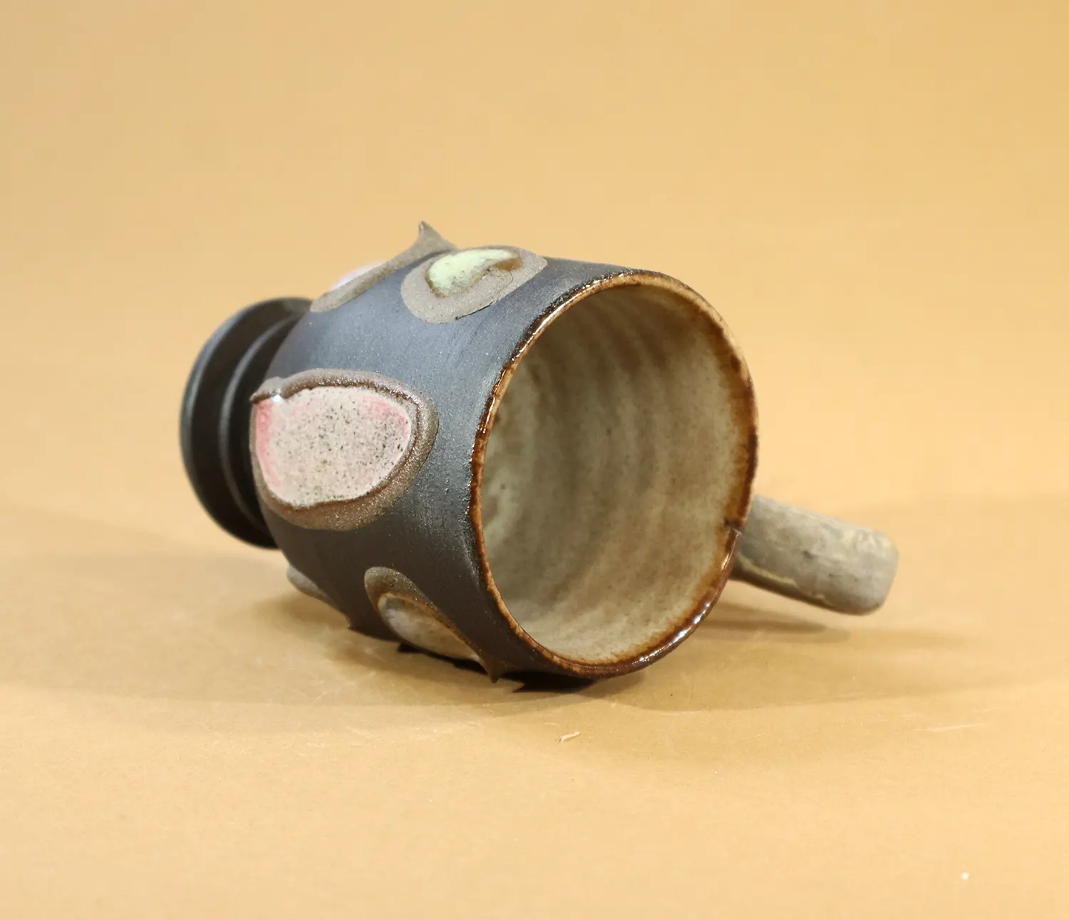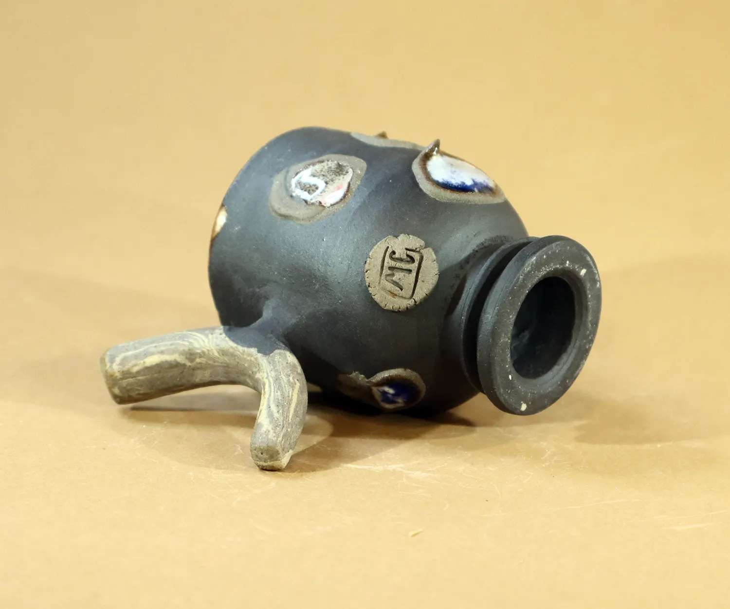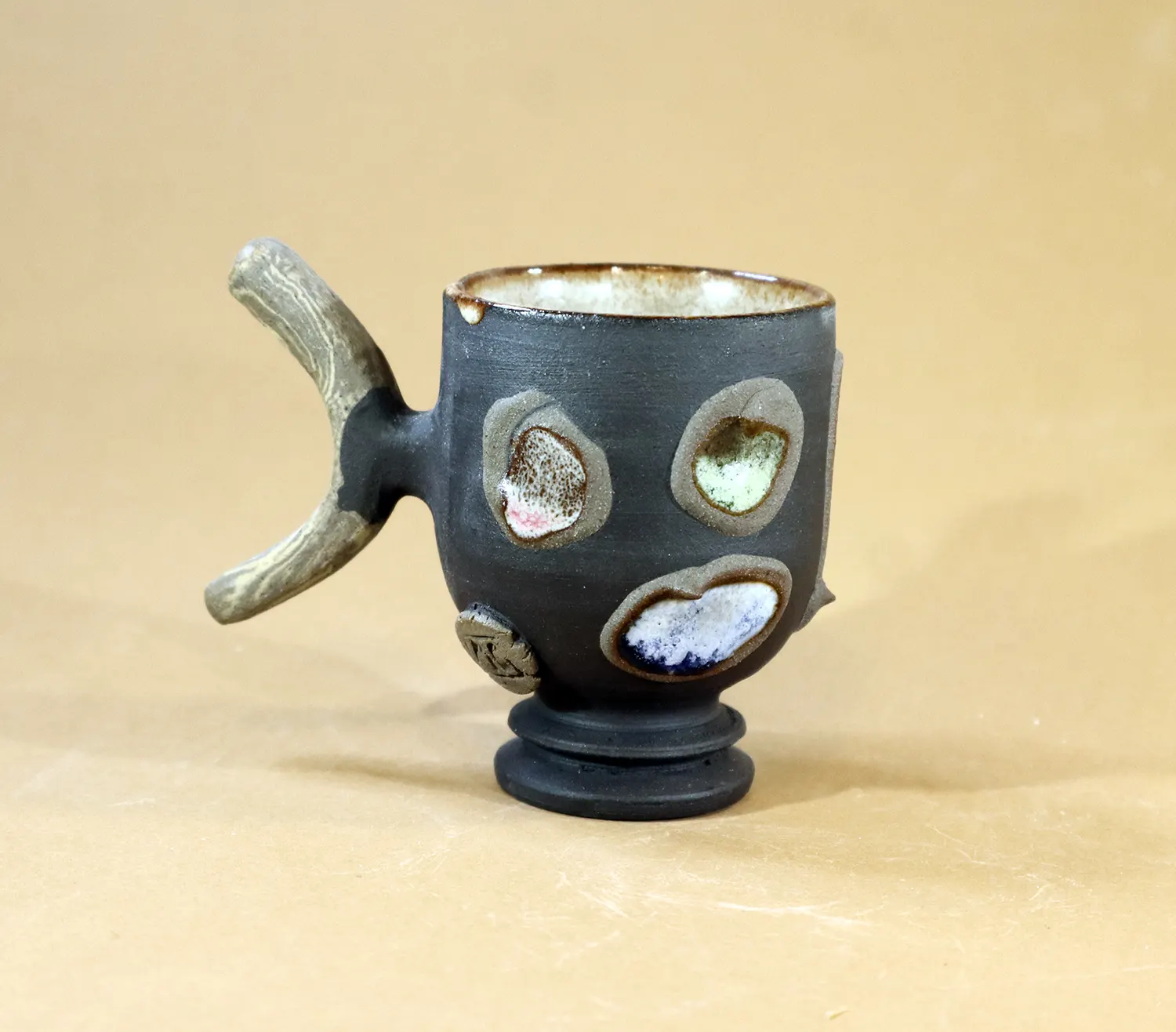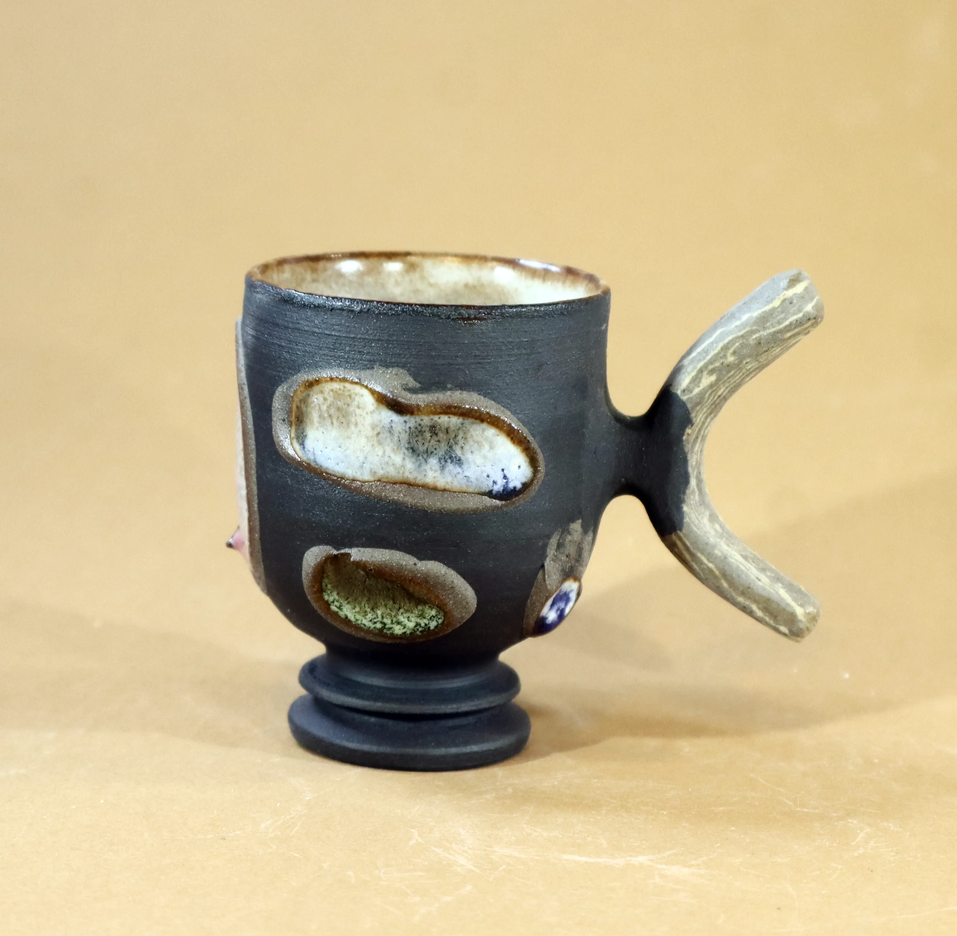 Il piede d'appoggio slanciato e lavorato con nette geometrie, si contrappone alle figure ovali disegnate sulla superficie, e il manico che ricorda un ramo lavorato dalla marea è realizzato con la tecnica del neriage.