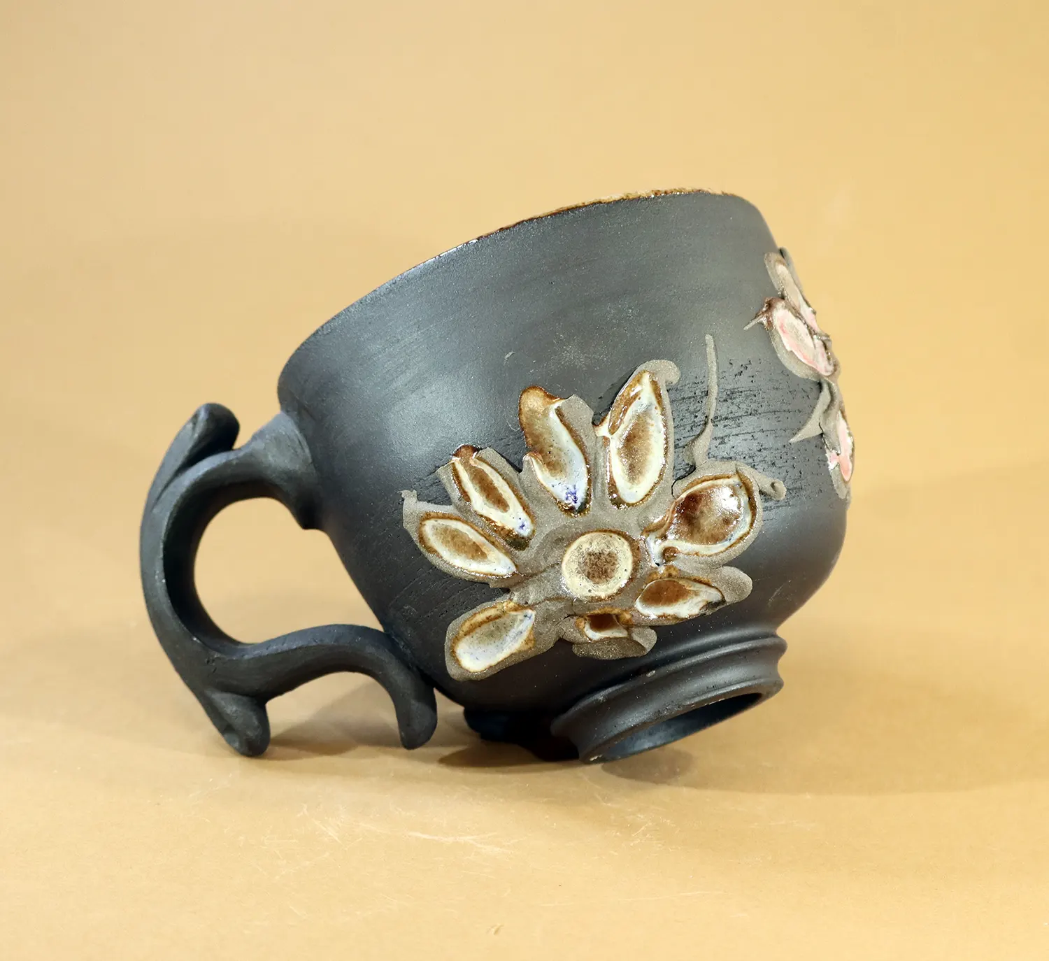 Il piede d'appoggio lavorato con nette geometrie, si contrappone alle figure floreali disegnate sulla superficie, e il manico barocco conferisce regalità alla tazza.